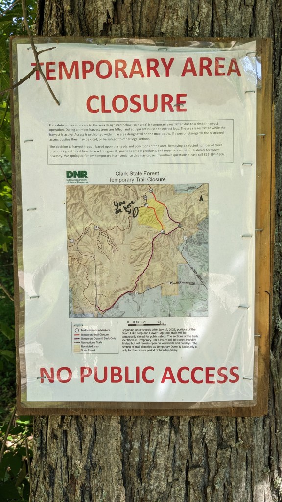 Soon after I began my hike, I came across a sign marking trail closures in the Northeast corner of the park. Had I started at the Day-use parking lot, I might have turned around at this point, but I had barely started and decided that I would just continue on until I had to turn around. As it turned out, the signs were over a month old and didn’t include the weekends. As it was 4pm on Friday, I decided that I was probably safe hiking through the closed area. Once I got to the line the tape that was normally across the trail was tossed in a neat pile off to the side. There were indications of logging and construction along that part of the trail, but it looked like it had been several days since any activity had actually taken place.
