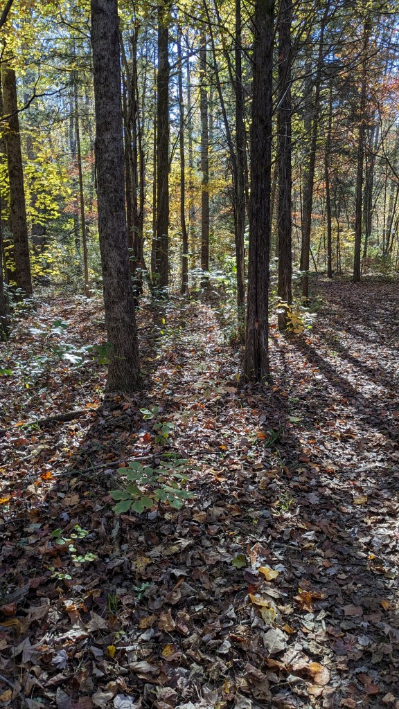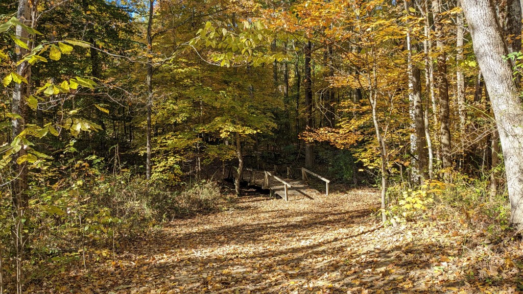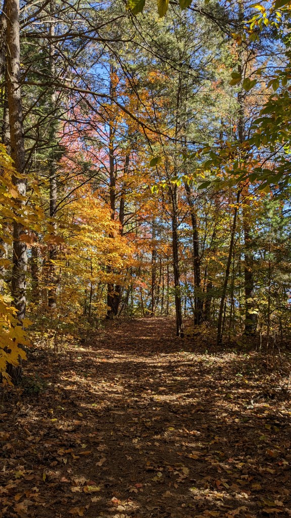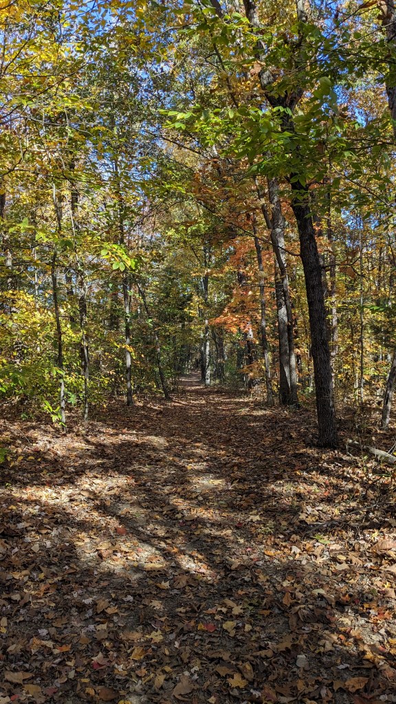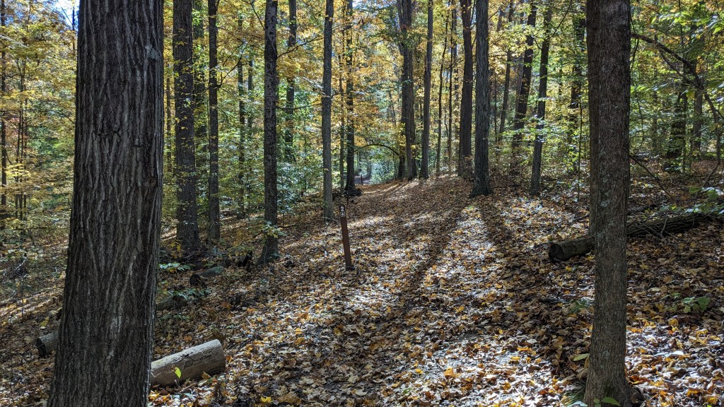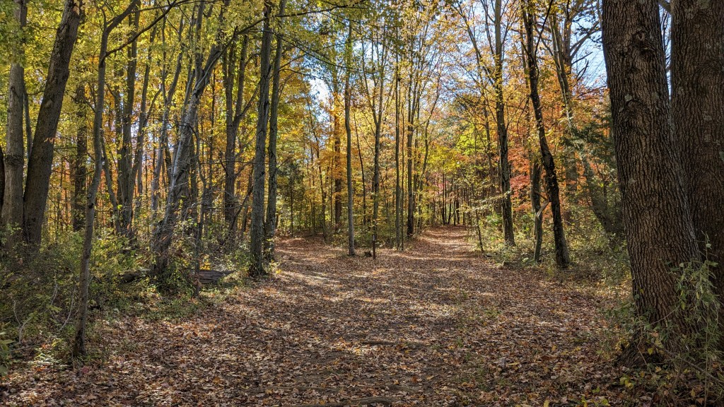 The trees were a variety of colors from green to brown to vibrant oranges and reds. The trail was covered in a blanket of leaves that crunched as I walked. The very first thing I noticed was how wonderful the trail itself was. It was wide and well-maintained. Even covered in leaves, there was little doubt about the path the trail took through the woods. The second thing I noticed was how generally flat the trail was. There were small very gentle ups and downs, but in my 5-mile walk, there was only one 20-foot stretch where I had to think about my footing and change my standard gait.