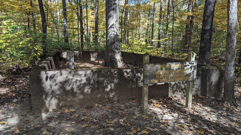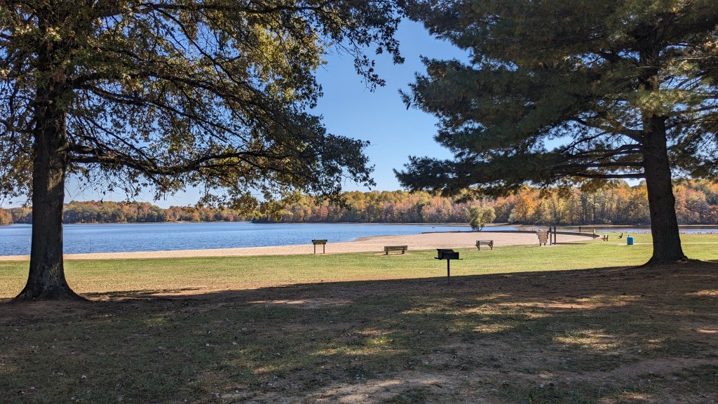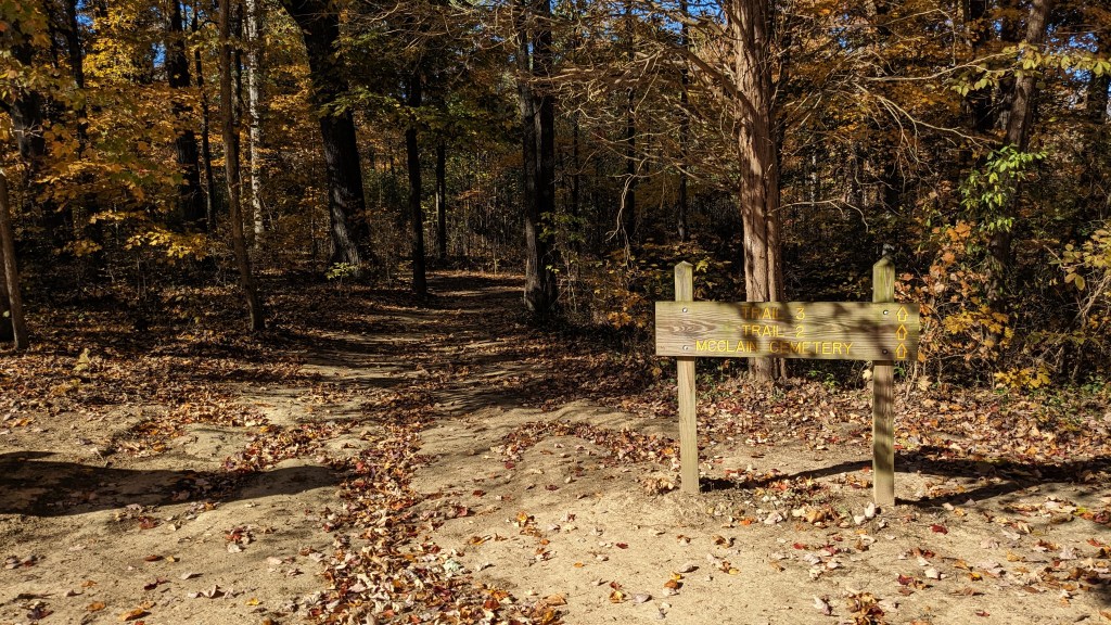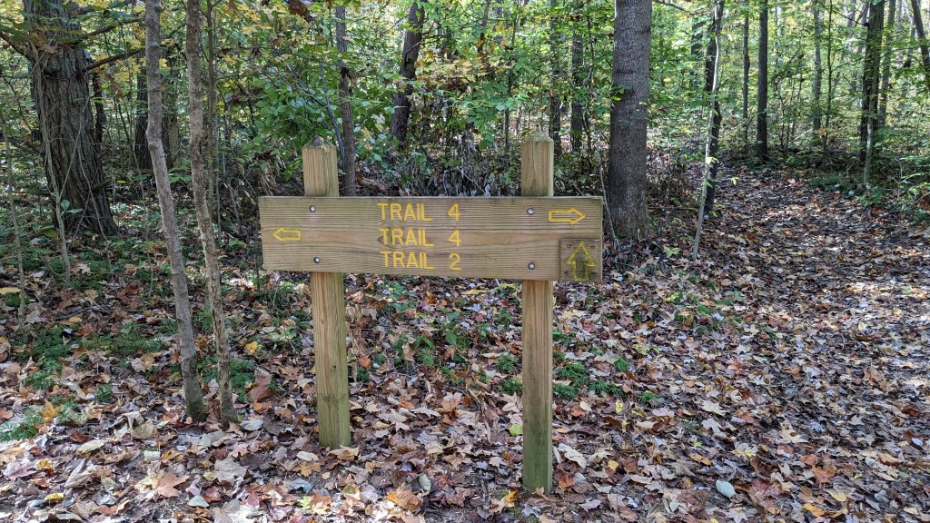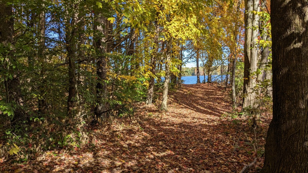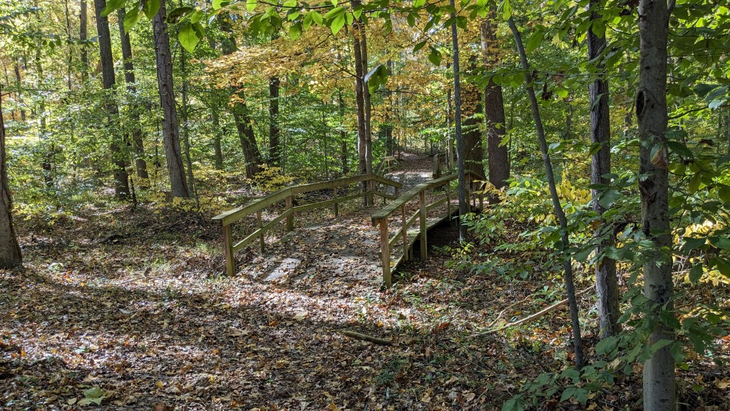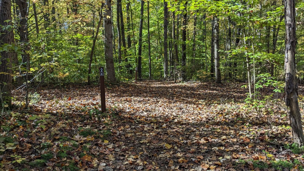 The trees were a variety of colors from green to brown to vibrant oranges and reds. The trail was covered in a blanket of leaves that crunched as I walked. The very first thing I noticed was how wonderful the trail itself was. It was wide and well-maintained. Even covered in leaves, there was little doubt about the path the trail took through the woods. The second thing I noticed was how generally flat the trail was. There were small very gentle ups and downs, but in my 5-mile walk, there was only one 20-foot stretch where I had to think about my footing and change my standard gait.