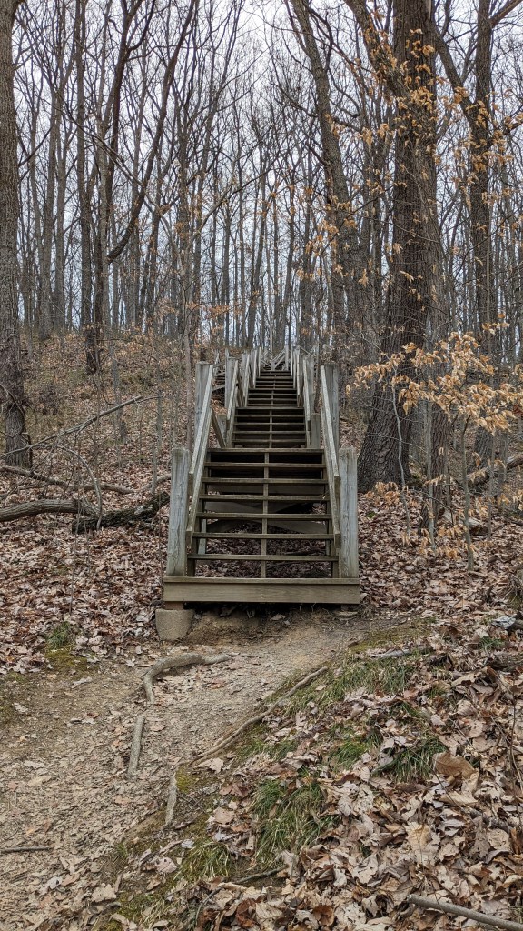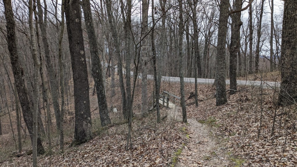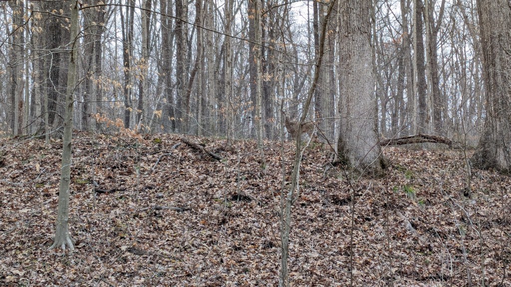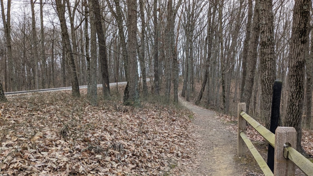 From here, trail 8 follows the road back to the West Entrance. There are picnic spots along the way. I can remember stopping at some of them for different events from my childhood. Despite the relative ease of this part of the hike, it was still farther than I expected back to the parking lot where my car was. I kept thinking just over that hill, and then another, and another. Eventually I caught sight of the small wooden lookout tower and the trail came right back to where I started. All in all, I calculated that I hiked around 7 miles. That was the farthest that I have hiked since starting this project. I suppose the cold temperatures made it easier to hike farther without feeling like I was drained. Brown County is beautiful even on a cold and cloudy gray day. It was also a win for viewing nature as I got to see two deer and two bright red cardinals.
