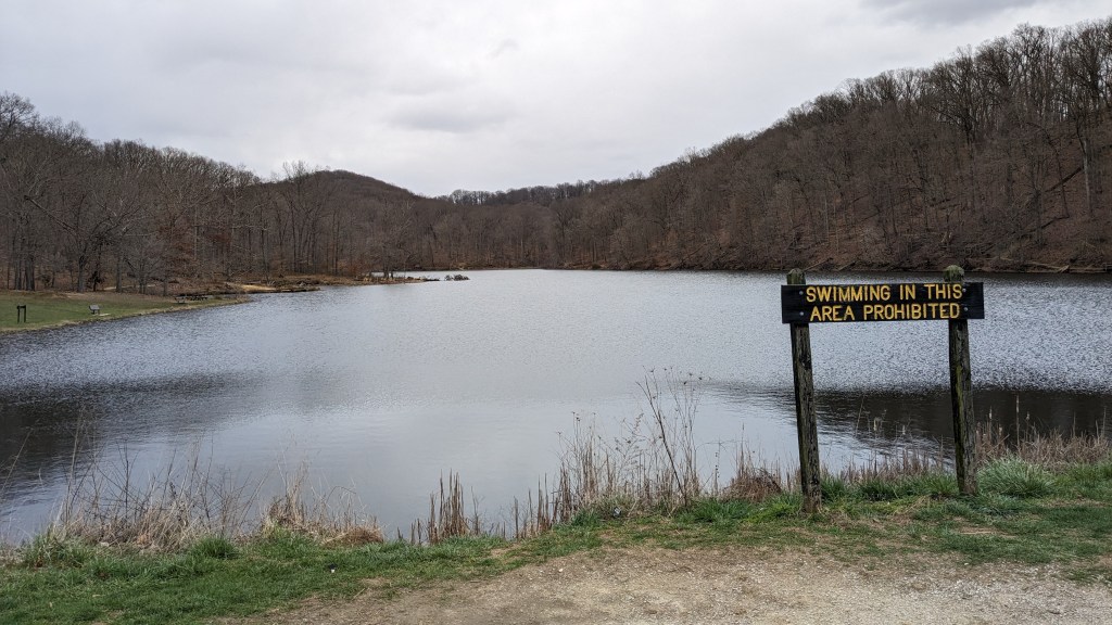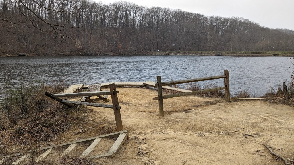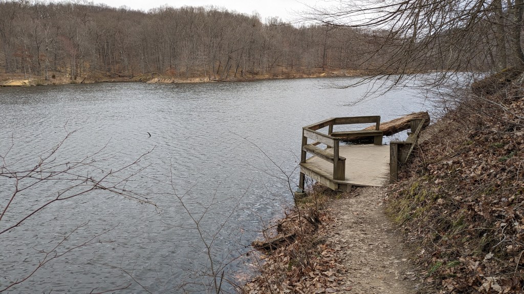 I reached the lake and saw 2 cars, but no people. I changed to trail 7 which is a 1.5 mile loop around the lake. I have hiked this trail many times in my life. Once I hiked part of it with my wife, Jennifer, when snow was on the ground and the lake was frozen. It was not nearly as cold this time. Even though I knew my way, I was again pleased to see that trail 7 was clearly marked and had lots of wooden steps and bridges to help with the harder to navigate areas. I started the loop at the dam side with the spillway and overflow pipe, then I hiked halfway around the lake.