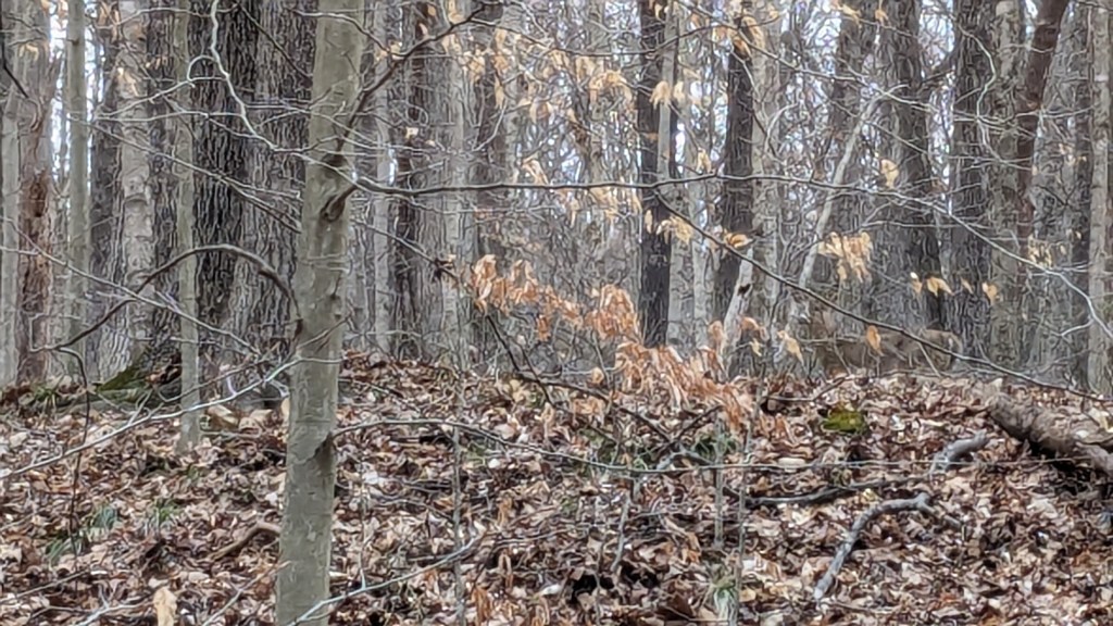 Hiking along trail 4 snow began to fall. It was not heavy at first and I think the air temperature was probably still not quite freezing, so the snow was icey. The small ice crystals landed on my dark blue coat and made it look like it was bedazzled. At one point, I stopped to take a picture of it and heard a large branch snap behind me. I turned to see a doe looking at me. She wasn’t scared, just curious. I was able to get my phone out and take a picture or two before she moved on. She was followed by another as they made their way back into the woods foraging for food. This was the first deer I had seen while hiking since Deem Lake last summer. I have been surprised at how few I have seen in all of my hikes.