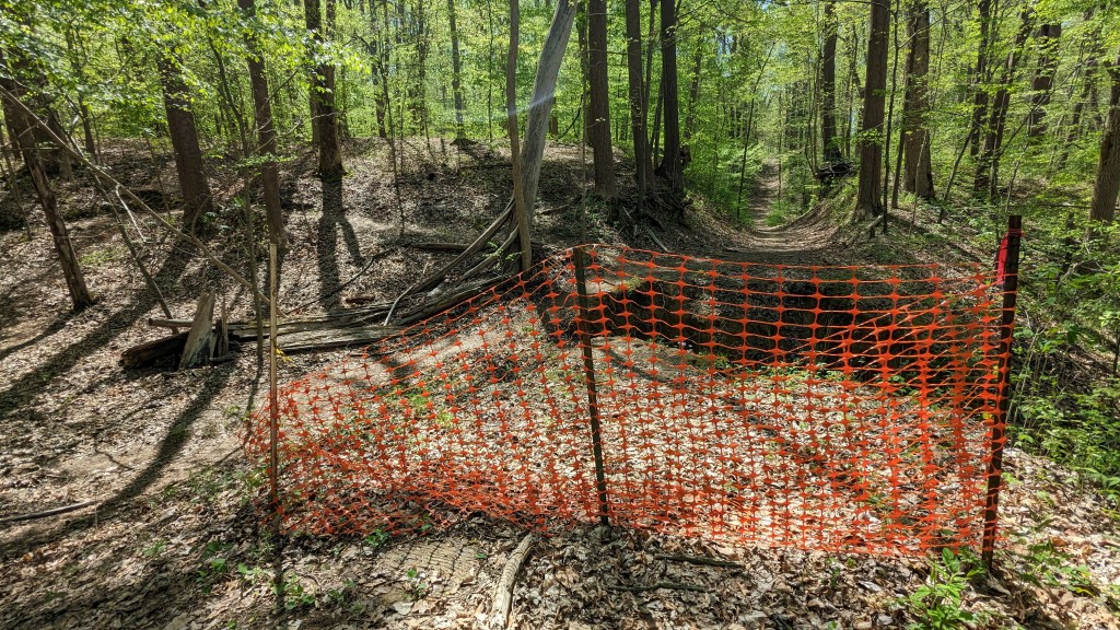 After crossing the road, Trail 4 was another fire road. At the bottom of the hill from the road was an orange plastic fence like the ones used at construction sites. It looked like the whole road was blocked, but getting closer I could see that while a large part of the road was indeed missing and had washed away, there was a small trail around the fencing. Off to either side at this point were much smaller, more traditional looking trails that led off to the left and right. Brand new signage clearly told me it was a Mountain Bike Trail. The nice signs for the bikers made me a little jealous. Even here, there was no Trail 4 sign, so I pulled out my map and guessed that I should continue down this fire road.