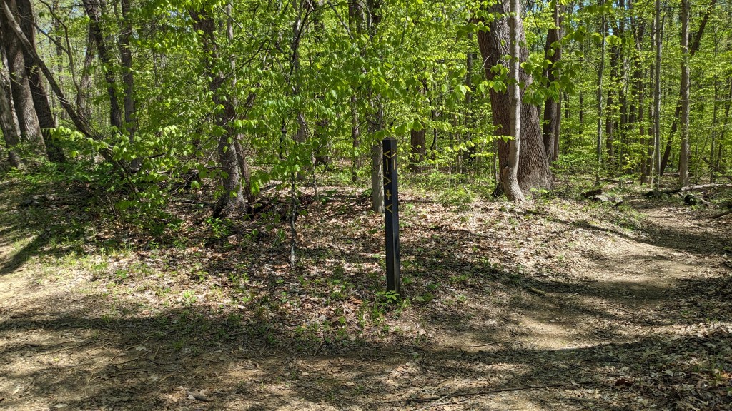 The new route had no signs, including where I had to walk along the road for 20 or 30 feet. I found my way though and continued along Trail 1 which now was doing the same thing as Trail 4 had done early weaving near and away from the road over and over. I came to another Trail sign at a turn, which I swear was just plain wrong. As I walked past, I tried to imagine it turned to see if any orientation made sense, but I don’t think that was possible. The arrows were simply in the wrong direction. Luckily, from my direction the right way was obvious, but someone walking the other direction might have been a little confused.