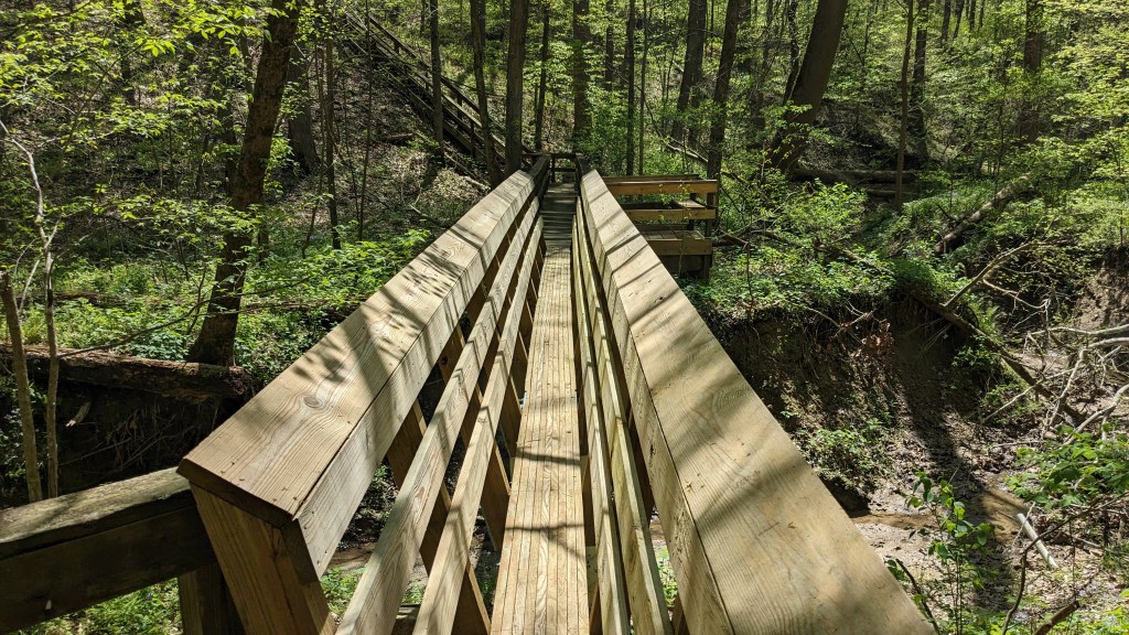 Back at the 4-way junction, I chose to go straight and do the larger part of Trail 1 which was a loop from here to the Youth Group Camp area and back. Trails 4 and 1 went the other way continuing together along the road, but I took the larger part of the loop which headed deeper into the woods. I soon came upon a large staircase heading down into a ravine. Some of the steps had been replaced, but at least one felt like it was ready to break under my weight. Once at the bottom, I crossed a small bridge and then found an even larger staircase leading back up the other side. It was long enough to get me huffing and puffing by the time I reached the top. Much of the trail system through the park is pretty flat, but when the trails do go up or down it is always pretty steep. Another flat section led me out to a parking lot at the end of the Youth Camping Area. Here again, there were no signs. No sign for me or for someone who was going the other way and looking for Trail 1. I was again very glad I had my paper map.