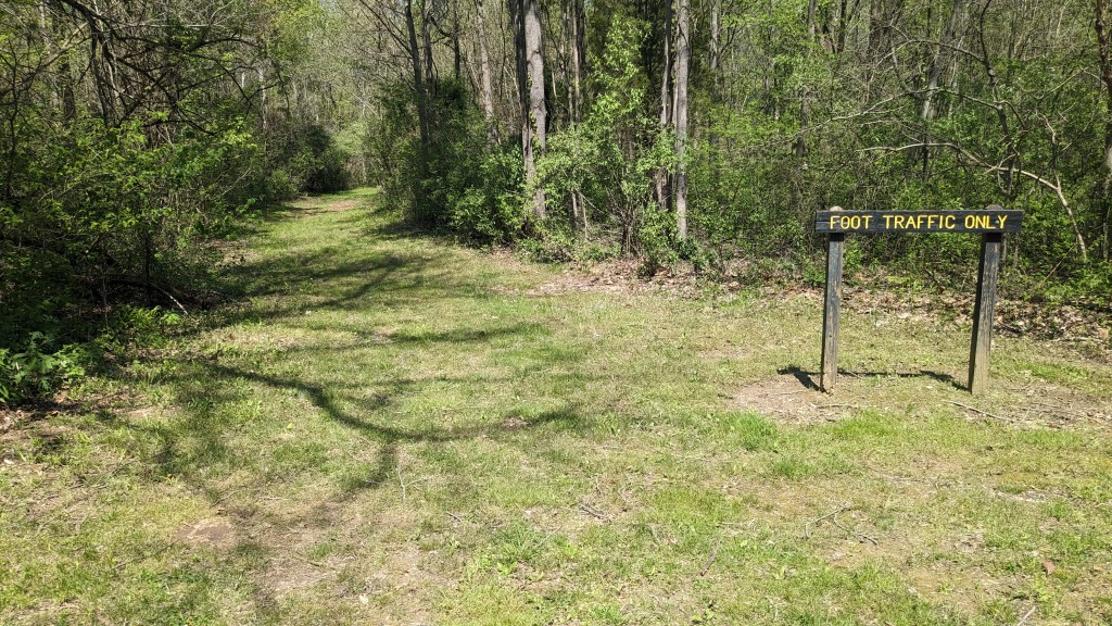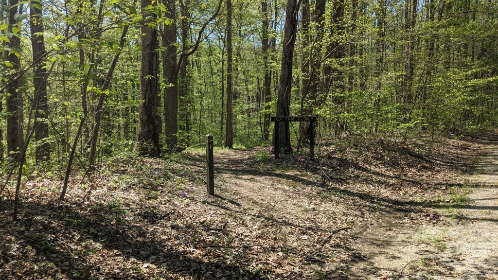 This part of Trail 4 was straight, but it was not flat. It had three large hills in a row. At the top of the second hill, I could look straight across to the top of the third, understanding I had to go down and then back up to get there. None of these were super steep, and there were actually benches at the top of each hill. At the top of the third hill was the main road. Where the trails crossed roads were the best markings, however rarely did they include a trail number. I just looked across the road and saw another sign that said “Foot Traffic Only.” It was clear where the trail went, but if you had been driving along you wouldn’t know which trail.