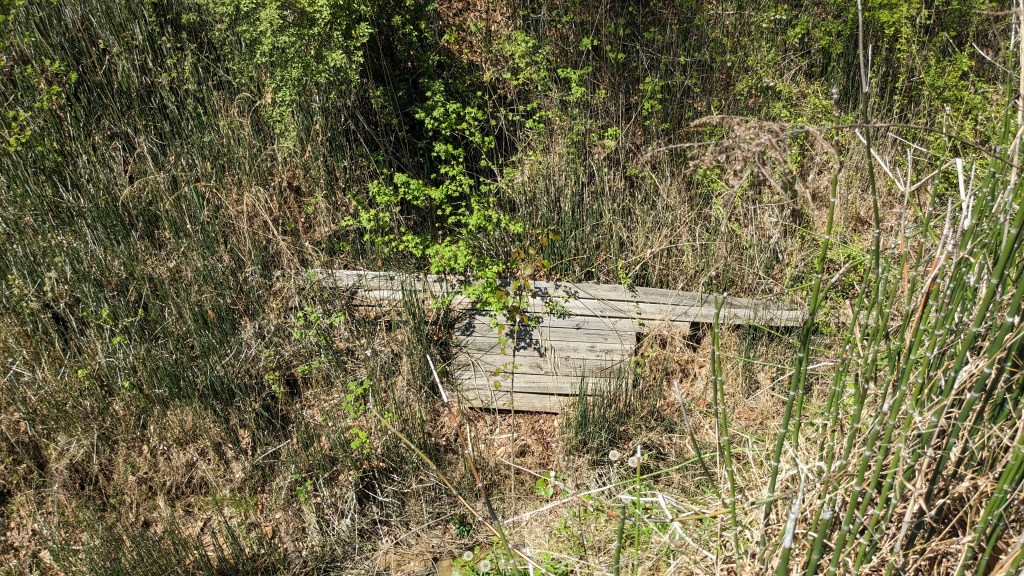 Trail 5 had no signage at all anywhere. I guessed at the trailhead when I saw a nice wide grass fire road, and a sign that said…drumroll please, “Foot Traffic Only.” I walked down this large grass path and soon saw the pond to my right where it was shown on the map. I think pond might have been an overstatement though. At the end of the path was a large viewing area, though I could not tell you what you were supposed to view. The pond was on the other side, and standing on the viewing platform there seemed to be only trees and vines to look at.