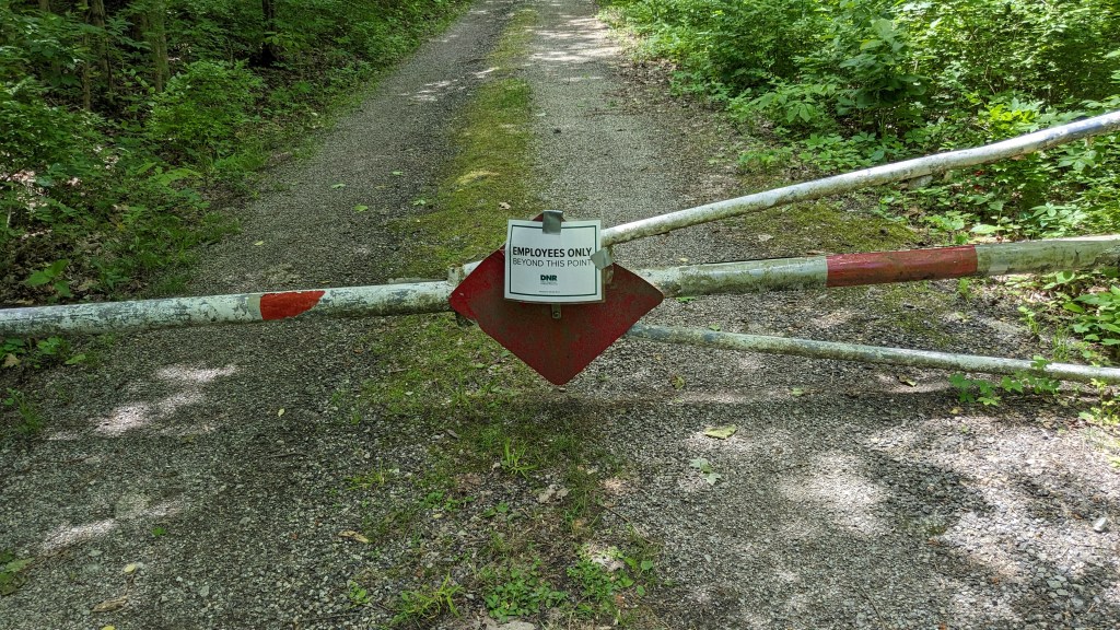 Driving into Mounds SRA, I got a map as I always do…and a good thing, too. The signage was not good. I drove all the way down the one main road to the beach shelter parking lot. According to the map, the trail crosses the road close to this area. I found a bathroom that was open, but no sign of the trail. I drove back up the road to the next parking lot. This seemed to be a parking lot and a bathroom, and that was all. As I pulled in, there was a fire road just beyond the parking lot. Based on the map, I was sure it must be the trial. I parked, got all ready to go, and headed down the fire road. I made it around the first turn and came to a gate with a sign that said, “Employees Only Beyond This Point.”