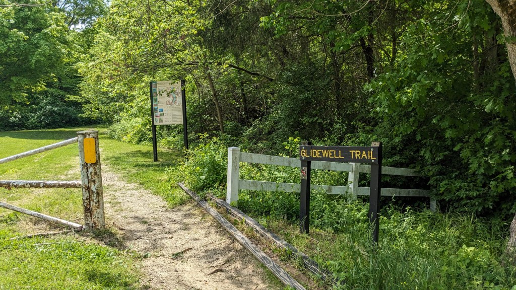 I walked back to my car, now getting frustrated, and drove back up the road. From this direction, the signage was much better. I quickly found the trailhead and a gravel parking lot next to it. The signs were all pointing in this direction, which is why I missed them on my first pass. The trail sign said “Glidewell Trail,” so I had to look up the map again and make sure that Trail 2 was in fact Glidewell. With that confirmed, I headed down the trail.