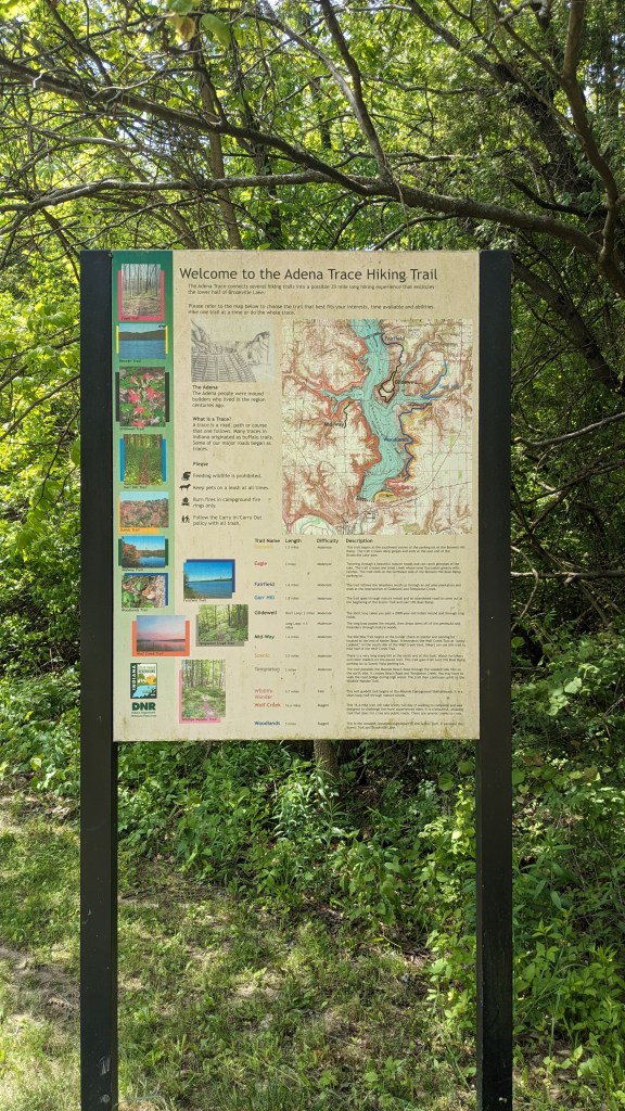 The trail was fairly flat despite being on the side of a hill. There were a couple of times it turned and went straight up the hill, but then soon returned to a basically flat trail. It was a trail for sure, and not a fireroad as the the start was, and almost all of my trails have been at my last two parks. The trail was easy to follow, and eventually, I came to a large sign and a very small hill. The sign said, “Glidewell Indiana Mount 10BC” The mound itself now had the same trees and brush growing out of it that everywhere else had. Without the sign, there is no way I would have seen it for what it was. The sign was large enough for passing cars to read (if there had been a road anywhere near it). It seemed out of proportion for the location. Another equally big sign was on the other side of the small mound for hikers coming the other way.