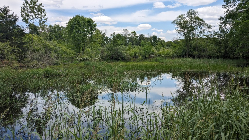 I had a choice now, to backtrack or continue around the short loop. It was probably longer, but I decided to continue on and see more of the trail. I passed a small pond filled with croaking frogs, and then met a fire road. No doubt the same one I had started on. Another large sign pointed right down a fire road and said, “Short Loop,” the trail I was on continued back into the woods with a sign that said, “Long Loop.” Nice large signs, hard to miss.