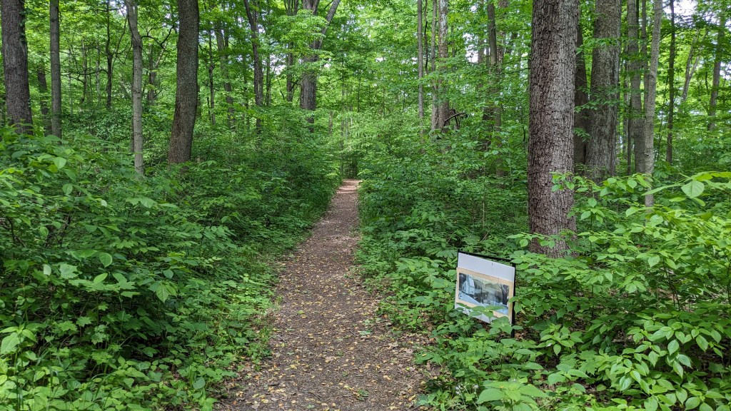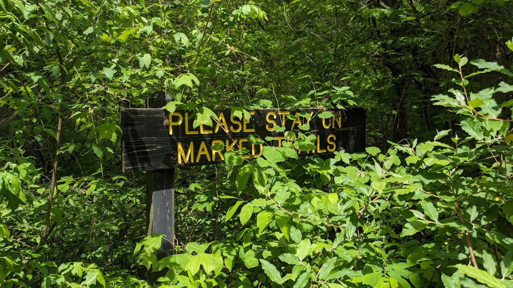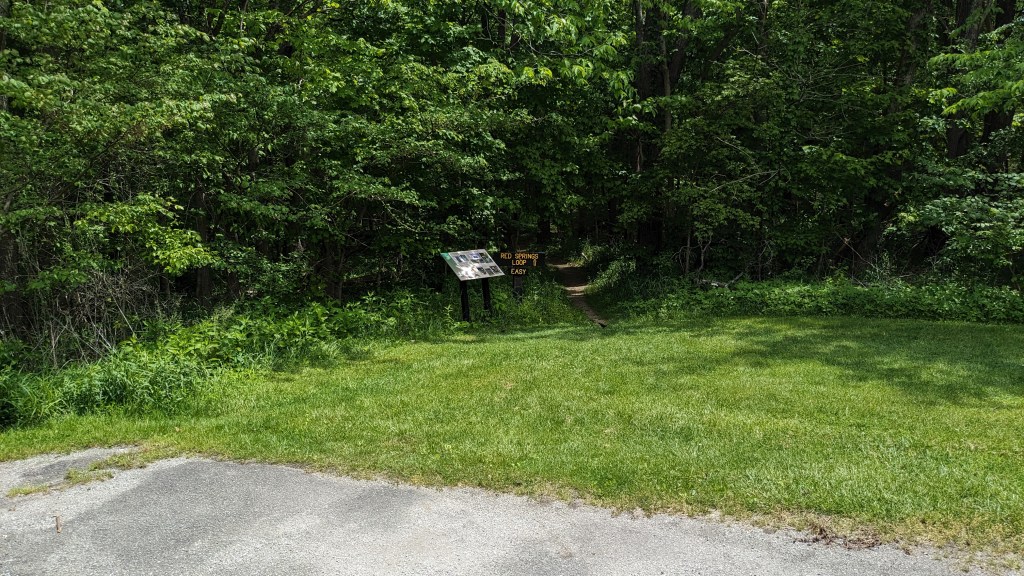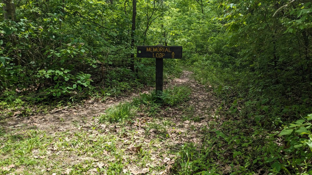 I started with the spot that was clearly a parking lot, however, there was clearly NO TRAIL at this parking lot. The map was very clear that the trail came right in at the end other parking lot. No room for misinterpreting, but I saw no trail. Instead, I had to find another spot. I finally pulled onto a gravel road next to a playground and then pulled off the road onto the grass. Once I was sure that the ranger parked across the road wasn’t going to come over and give me a ticket, I got myself ready and started out on the loop. It was clearly marked with a large sign, “Memorial Loop.”
