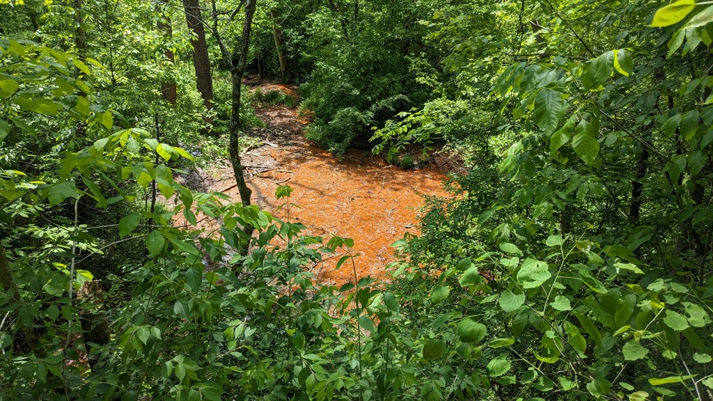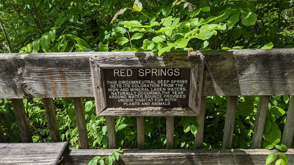 I decided to take the rugged side first. This side of the loop dropped down into a canyon and at the bottom was a very red spring and creek. There was an overlook that I thought had grown over, but the view was down, and from there you could see into the very red water of the natural spring. The sign at the overlook said that it was a circumneutral seep spring and gets its red coloring from iron and other minerals in the water. Despite its coloring, it is safe for the animals and plants.