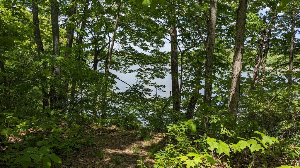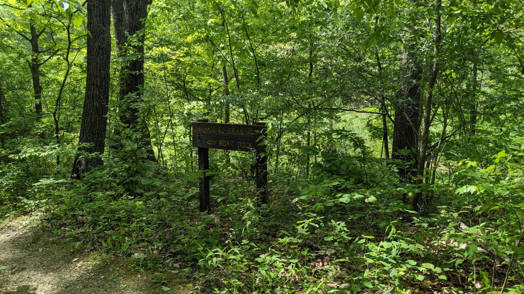 When I followed the far side of the finger back out to the main lake, I came to an intersection. Here the trail was clearly marked with a side trail to the boat dock. This was the trail I tried to find first, but couldn’t. If it followed the water around then It came out at a different location than the map indicated. That would have to be an investigation for another time. I took the left trail and continued my counterclockwise hike along Memorial Loop.