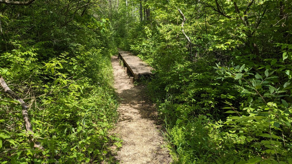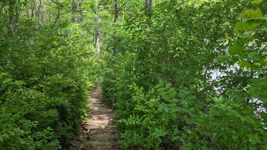 Along the way, there were benches every so often which would make nice stopping places. After close to a mile, I came out at “South Shelter” house, which was at the end of a one lane road. Had I come down this road, there were plenty of actual parking spots here right on the trail. Maybe next time I’ll park here. From here, I followed a finger of the lake back into a swampy area where there were plenty of bridges and wood structures to keep me out of the muck.