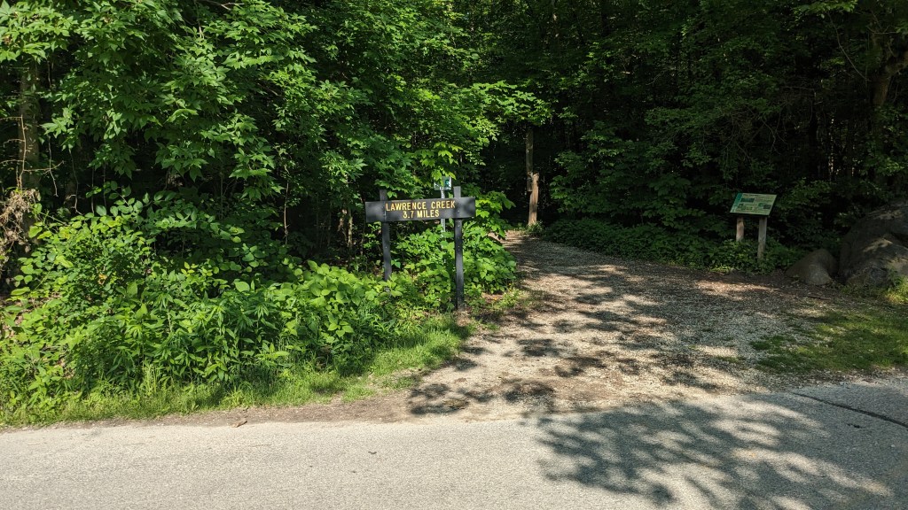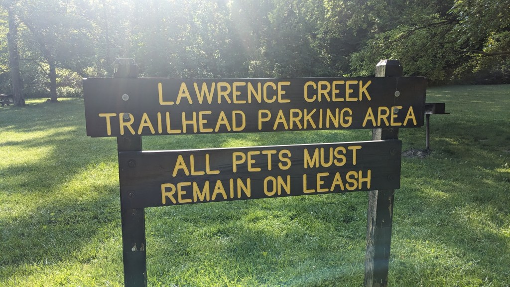 The longest hiking trail in the park is called Lawrence Creek Trail. It is a loop of just under 4 miles. The plot of land that the trail is on is completely surrounded by roads on 4 sides. Two sides are park roads and the other two sides are outside the park. I guess this makes the area the southwest corner of the park. The center of this area is a high point, maybe 100 feet, above the surrounding roads. This led to the formation of many small ravines leading out from the center to the roads.