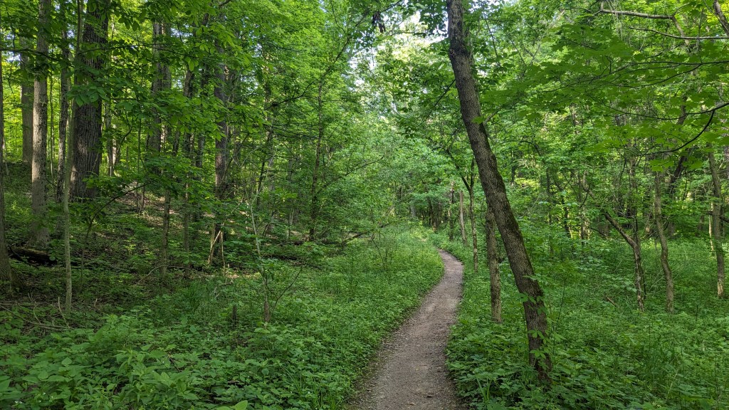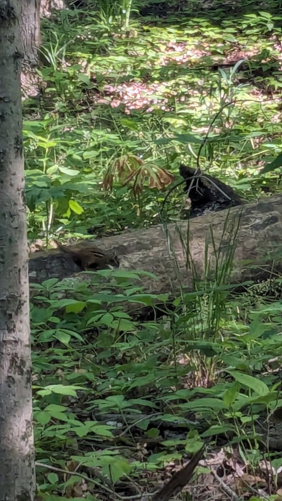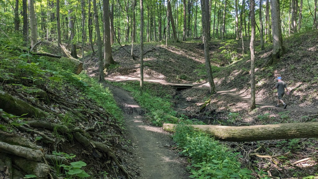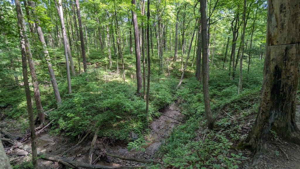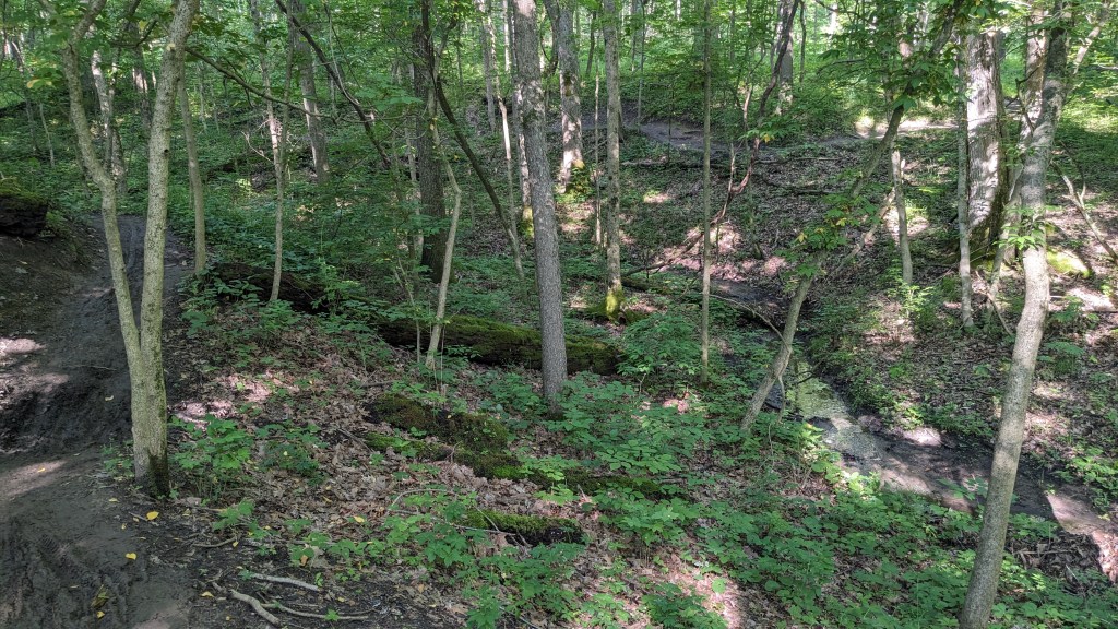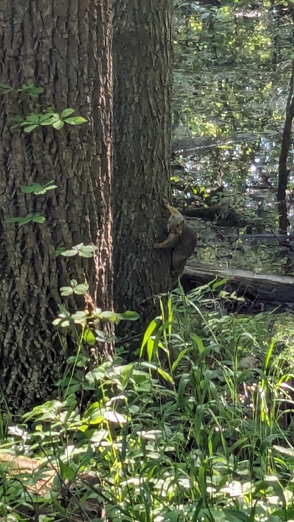 There was a dense tree cover over the entire trail. I barely saw the sunlight directly through the entire hike. The ravines still had water and there was plenty of short undergrowth, it seemed to be an overall wet habitat. One squirrel posed for me. I saw and heard a great variety of birds. They never seem to stand still long enough for a photo. The short vegetation meant that in most places you could see through the forest as far as the ravine hills would allow. It made the hike both isolating and visually interesting. The perimeter roads did have some traffic, but I wasn’t overly aware of it. None of the roads are major thoroughfares.
