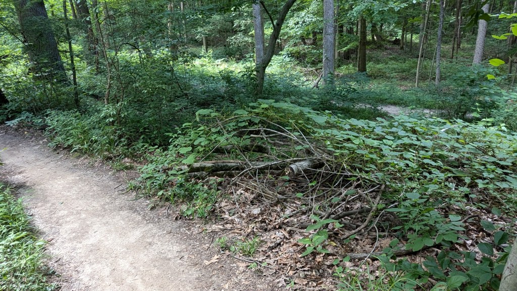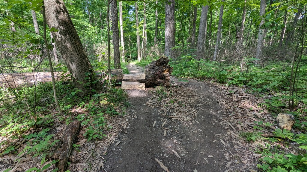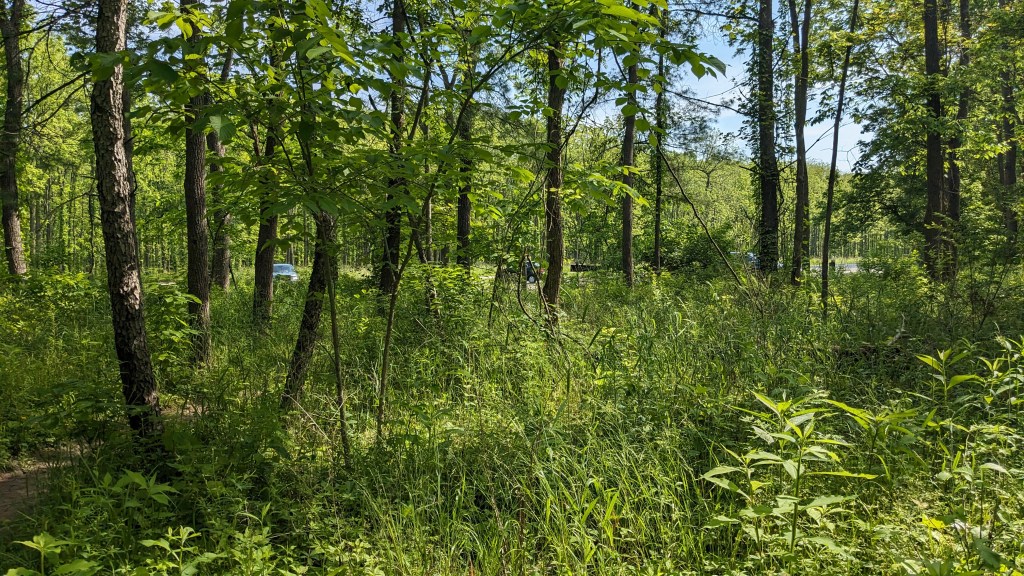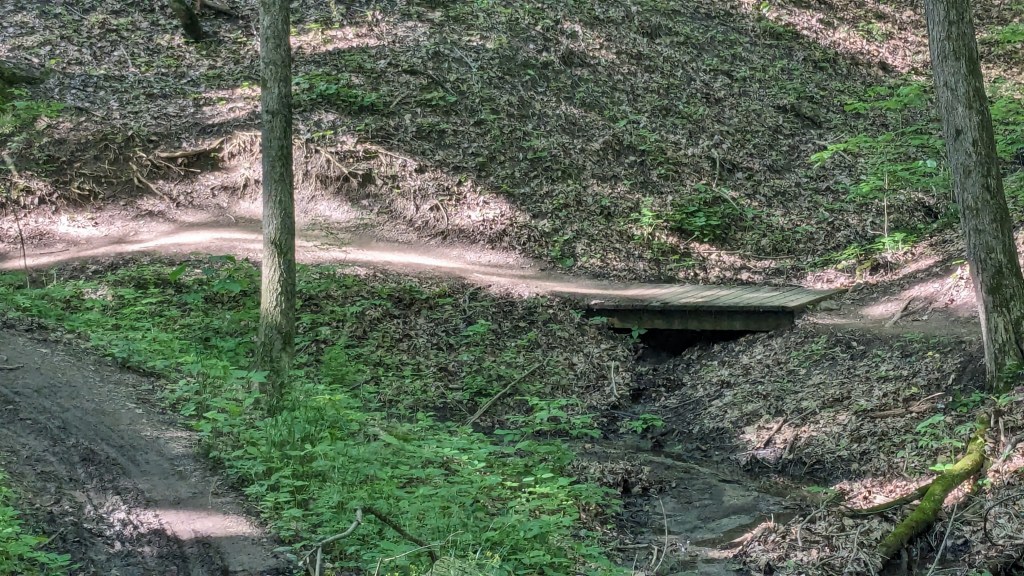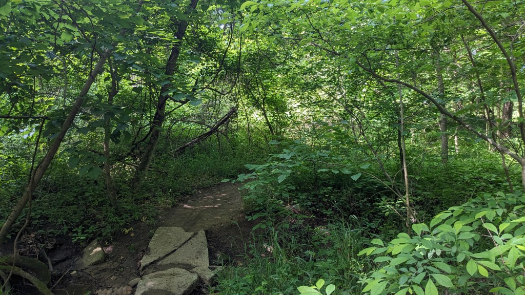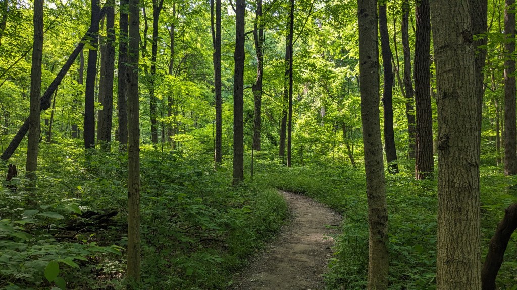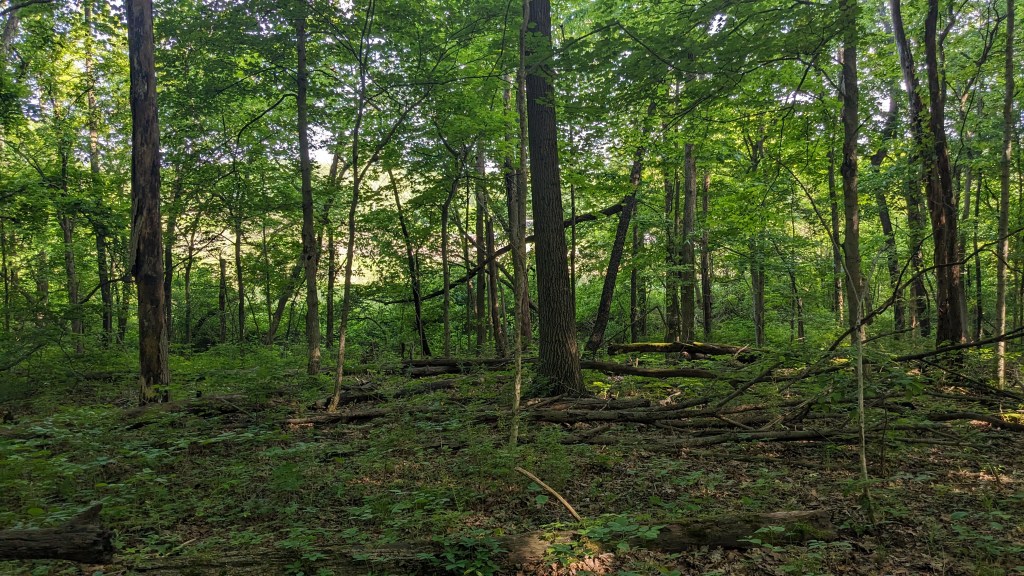 There was a dense tree cover over the entire trail. I barely saw the sunlight directly through the entire hike. The ravines still had water and there was plenty of short undergrowth, it seemed to be an overall wet habitat. One squirrel posed for me. I saw and heard a great variety of birds. They never seem to stand still long enough for a photo. The short vegetation meant that in most places you could see through the forest as far as the ravine hills would allow. It made the hike both isolating and visually interesting. The perimeter roads did have some traffic, but I wasn’t overly aware of it. None of the roads are major thoroughfares.