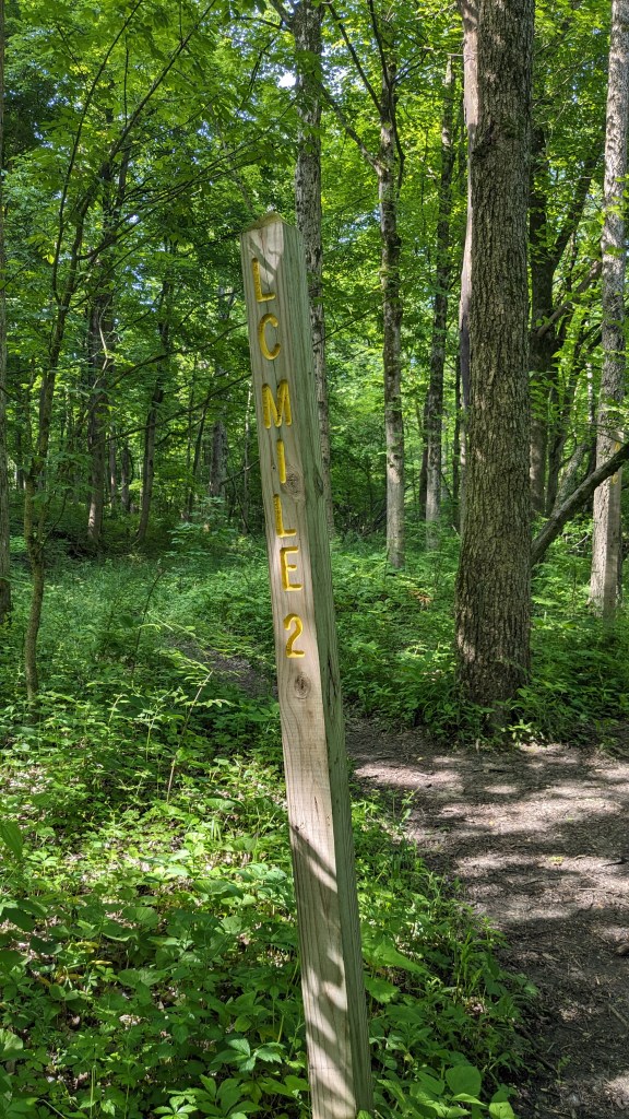 The trail was pretty well signed. There were only a couple of places where I could have taken the wrong path, but in those few places the correct trail felt pretty obvious. Someone decided to be helpful and put up mileage signs. The mileage signs were placed for a counterclockwise traverse around the circle and set based on my starting point. When I got to the 2-mile marker, I checked my own GPS activity tracking and it said 1.8 miles. I don’t fully trust my GPS, so I am willing to give them the benefit of the doubt.