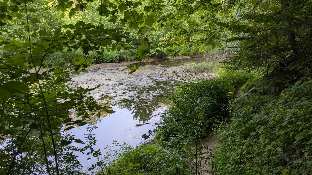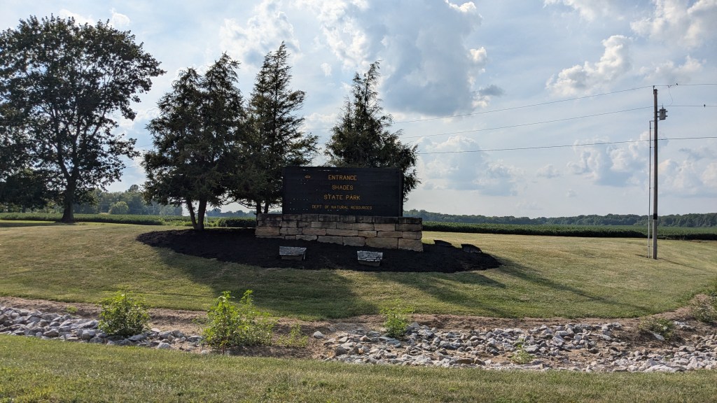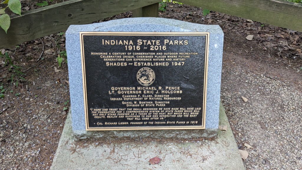 Shades State Park is a sister park to Turkey Run. They both include a section of Sugar Creek. As my dad says, the difference is that most of the hiking trails at Turkey Run are across the creek, and all of Shades State Park is on the same side of the creek. As a kid, I went on canoe adventures which started east of Shades State Park and traveled through Shades and Turkey Run State Park before ending.