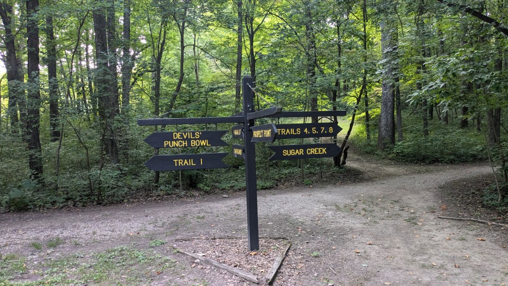 The signage at this park is wonderful. There are many signs along each trail. Even Trail 1 which is really a loop and then a gravel road through the middle is pretty well labeled. I followed the signs which led me in a counter-clockwise direction. I would HIGHLY recommend that you hike it in the other direction. My trek down into the Devil’s Punchbowl came from a series of stairs with some flat sections in between.