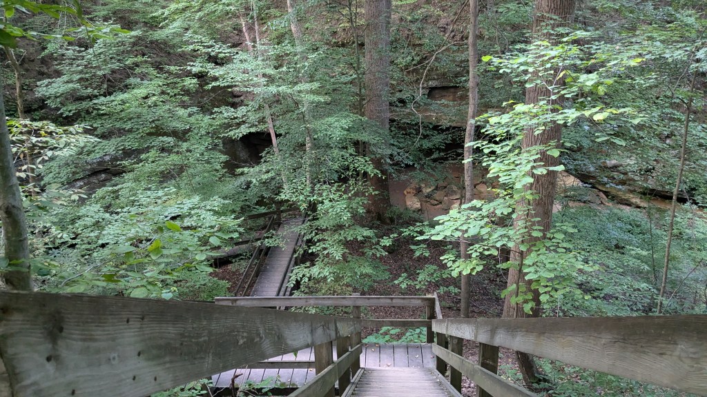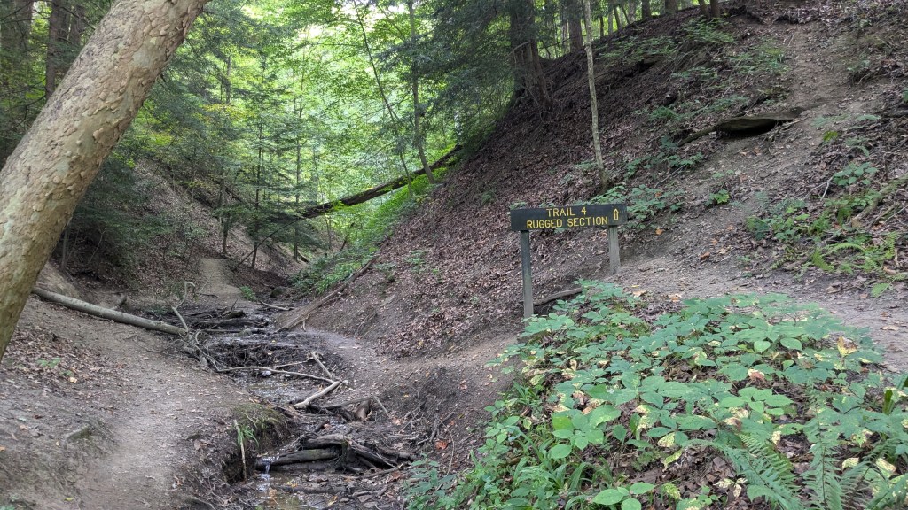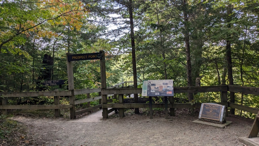 To hike Trail 1 in reverse, you have to look at the map closely and realize that Prospect Point is part of the Trail 1 loop. With this knowledge, the sign at the beginning which points to Prospect Point will guide you in the direction of Trail 1 as well. Despite the great number of stairs, I made it in my counter-clockwise route and took a moment to stop and enjoy the view at Prospect Point before returning to the Hickory Shelter House.