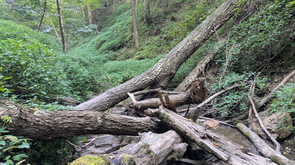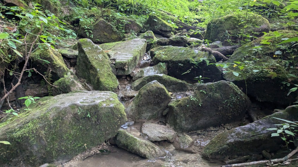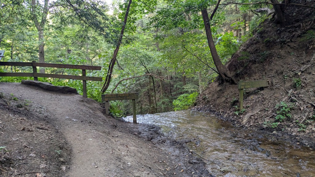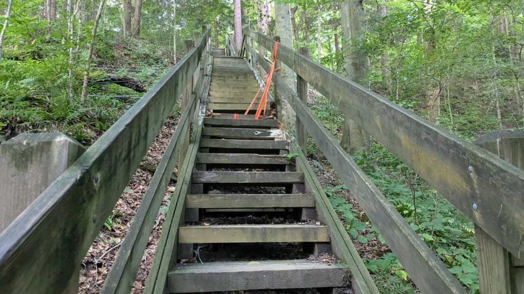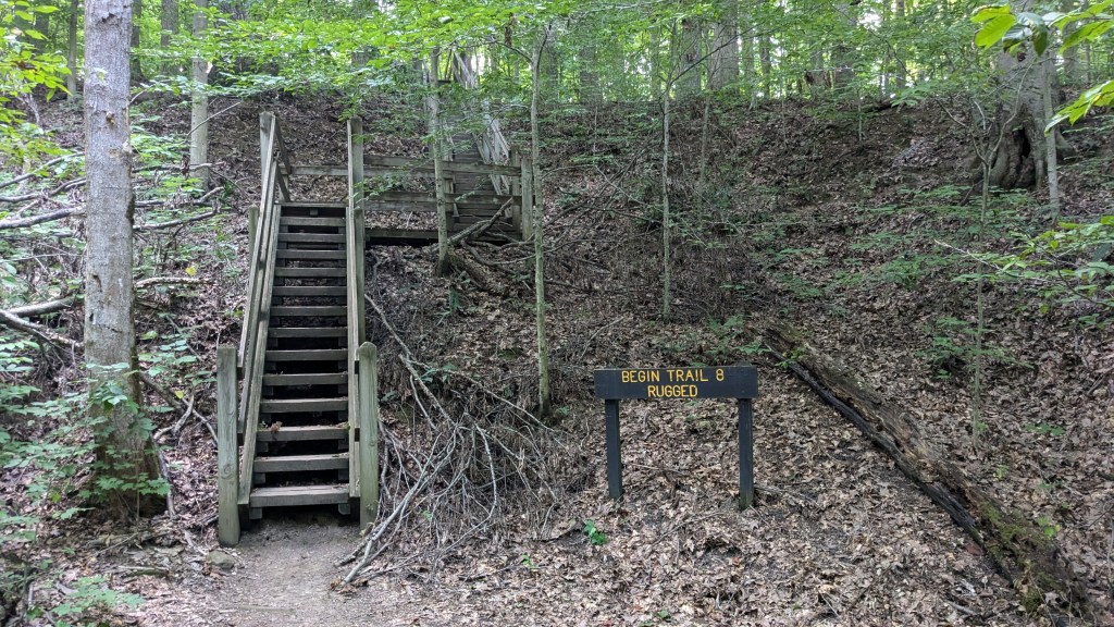 Finally, I got to the bottom of the canyon and came once again to Sugar Creek. Looking up the stairs to the moderate section of Trail 7 made the rugged section look better. They had broken stairs and orange tape. Despite the woods getting darker, my phone said I still had an hour of sunlight, so I headed up the Rugged section of Trail 7.