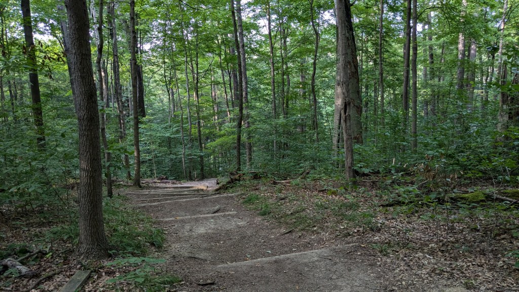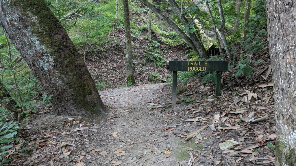 From here, I took a right to head over to trails 4, 5, 7 and 8. The first trail I came to was actually Trail 5. I turned and headed down the trail. This section of Trail 5 was the ridge version. What the signs called “Moderate.” The trail involved a couple of sets of stairs, but otherwise was pretty flat with just a small, but steady, downhill trend. When I got to Sugar Creek, I expected to turn left and take the other half of Trail 5 back up. However, Trail 5 turned right. Wait, what? I looked at the map and realized that the other half of Trail 5 actually ended in the middle of the Hickory Shelter area. It was not on the sign at the main junction at the Hickory Shelter.