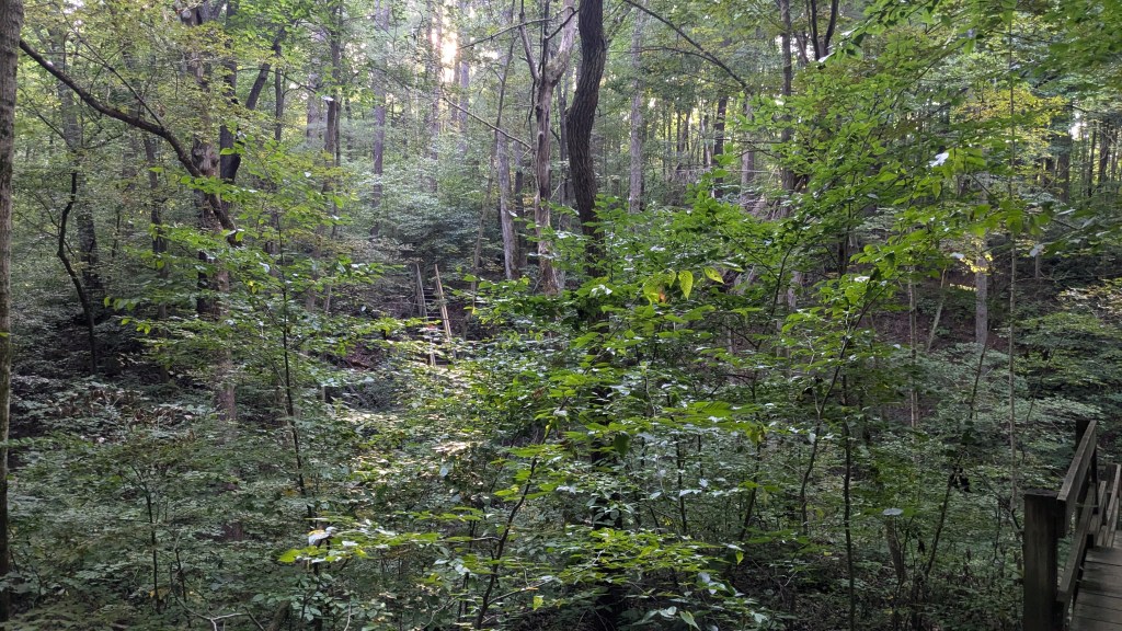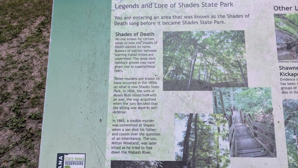 In the dark shadows of the forest, I stopped on my way out to look at a descriptive sign that was labeled “Shades of Death: The legend and lore of Shades State Park.” It was appropriate to read this as the shadows of night were falling around me. One could easily understand why it might have had that name. Despite the name, I really look forward to coming back to this park sometime to continue exploring its beautiful scenery.